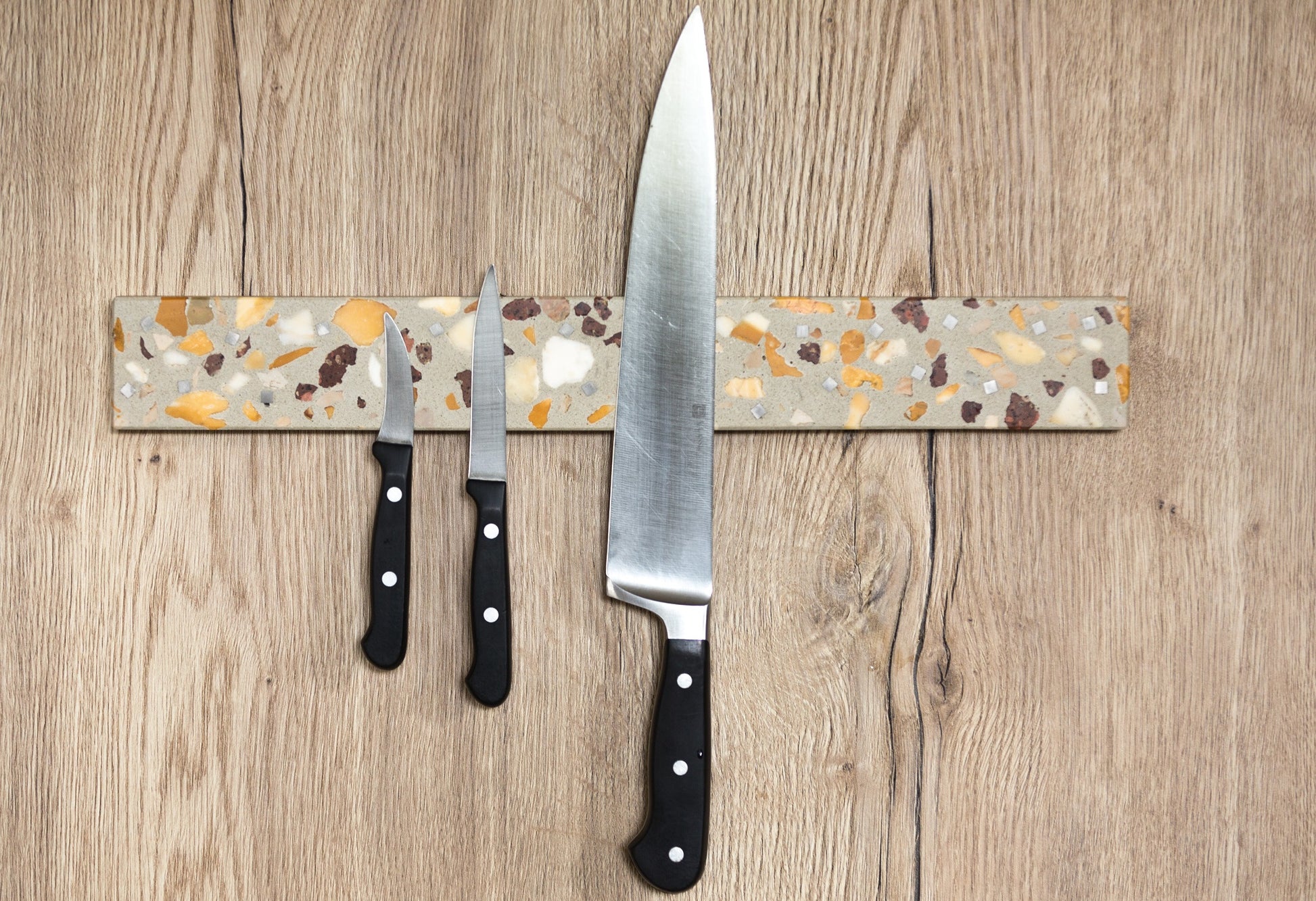 Každý kus je originál – jedinečná štruktúra a farebná kresba vznikajú kombináciou kamienkov a betónovej zmesi. Silný magnet spoľahlivo udrží aj ťažšie kuchynské nože, pričom ich zároveň elegantne vystaví na stene.