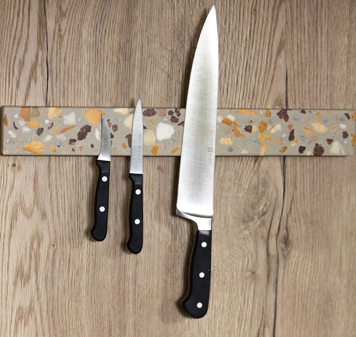 Každý kus je originál – jedinečná štruktúra a farebná kresba vznikajú kombináciou kamienkov a betónovej zmesi. Silný magnet spoľahlivo udrží aj ťažšie kuchynské nože, pričom ich zároveň elegantne vystaví na stene.