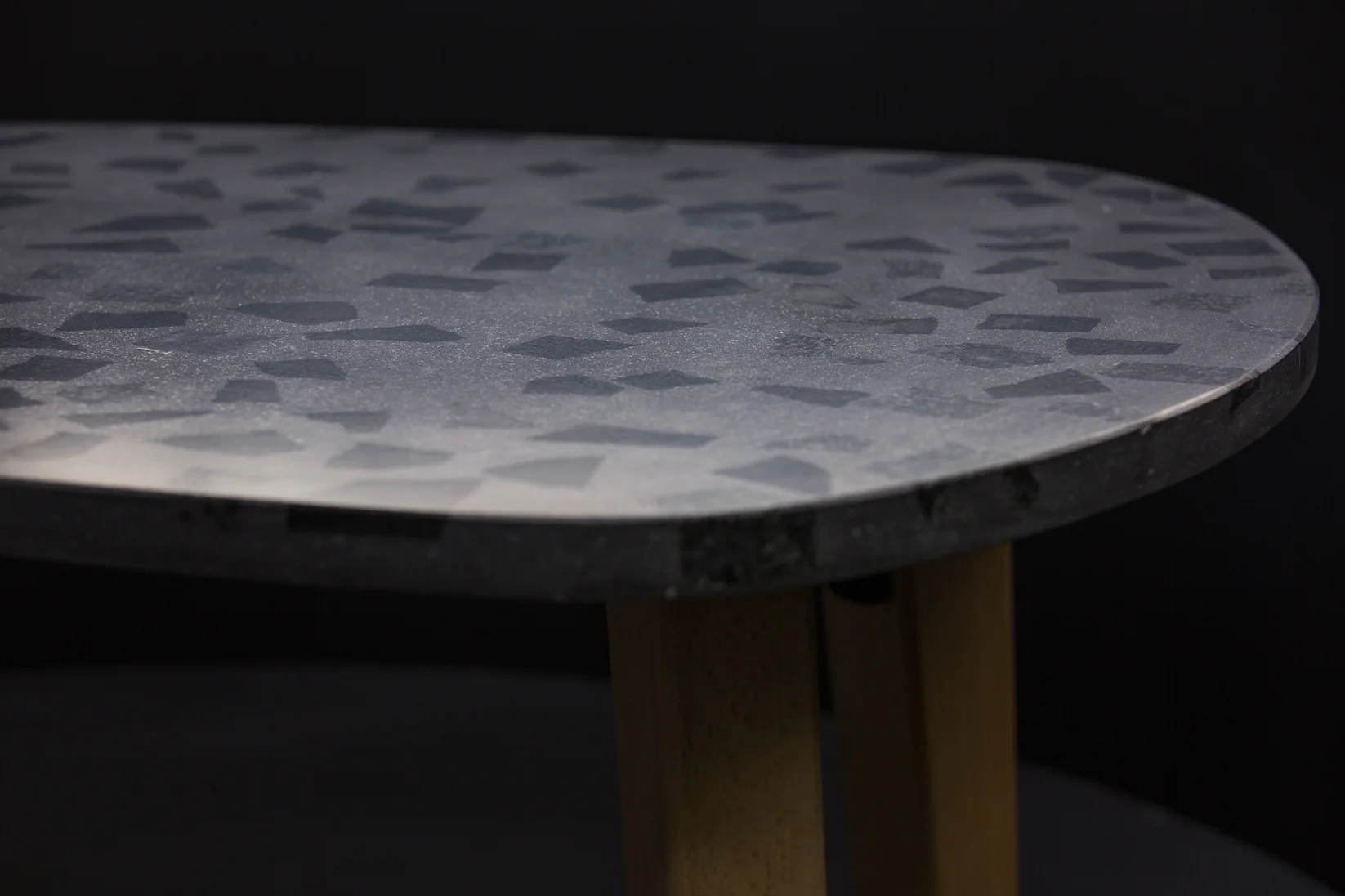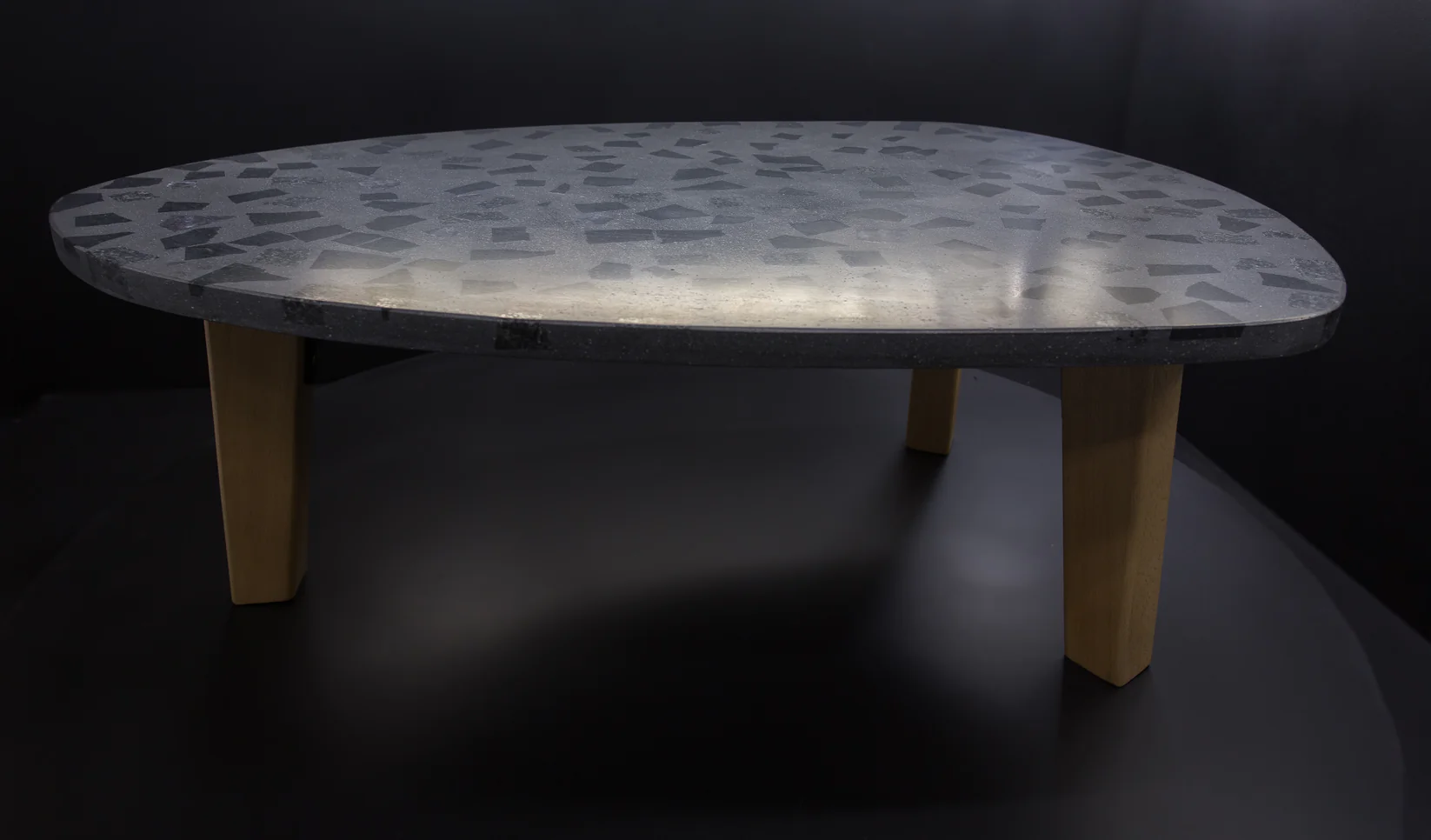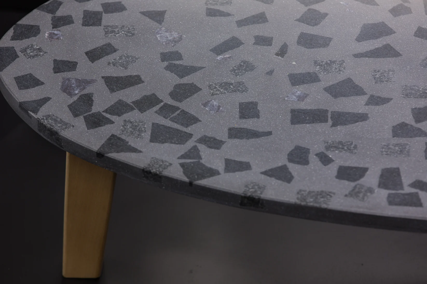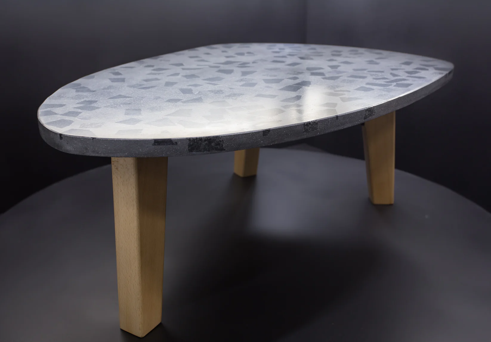 Tento exkluzívny terrazzo stôl (90 × 60 cm) v tvare gitarového trsátka zaujme svojou ušľachtilou tmavosivou povrchovou úpravou s kvalitným tmavým granitom. S výškou 40 cm stojí na troch stabilných nohách z masívneho bukového dreva, ktoré mu dodávajú prirodzený a robustný vzhľad.