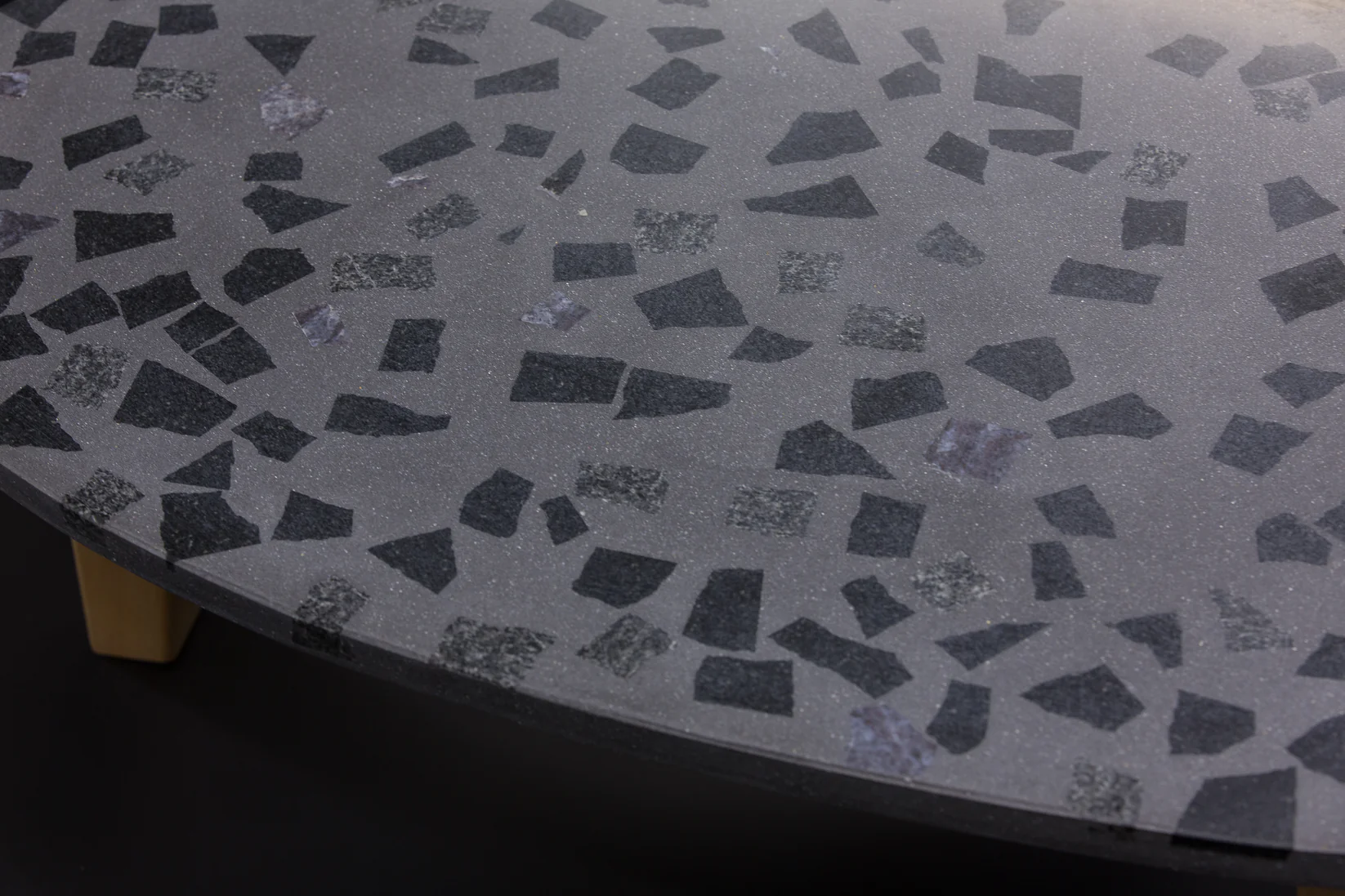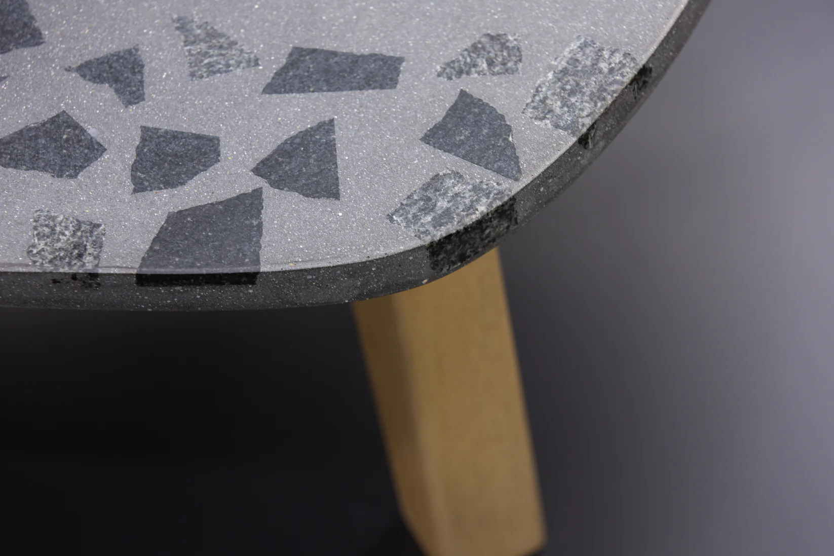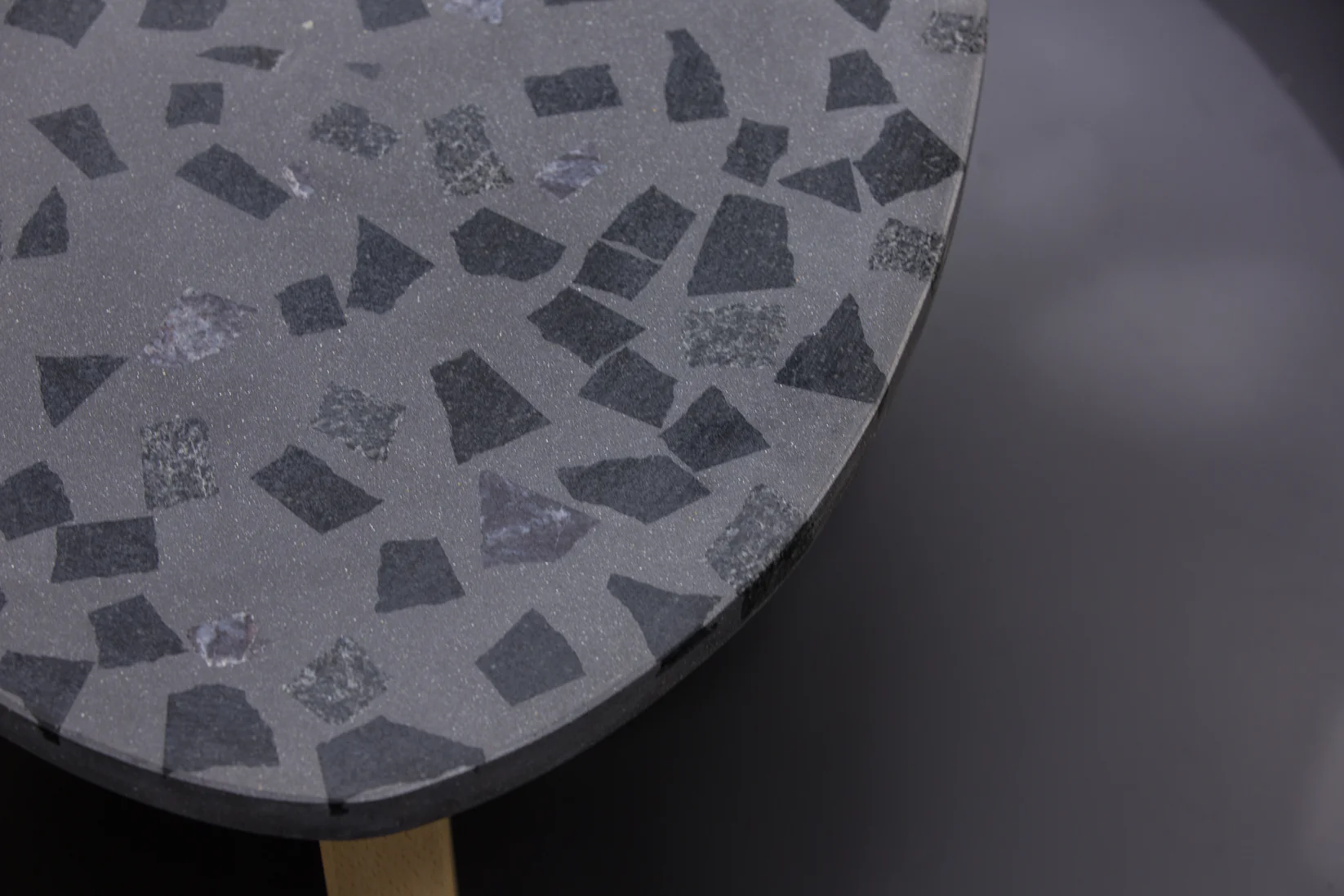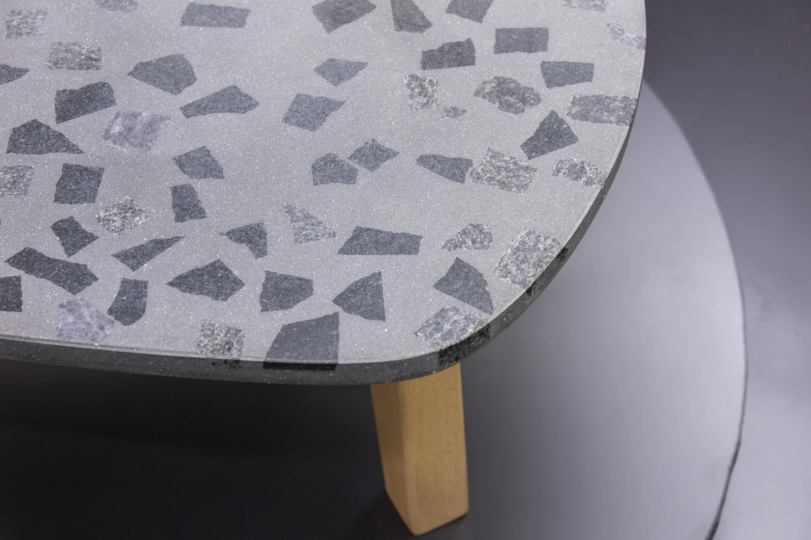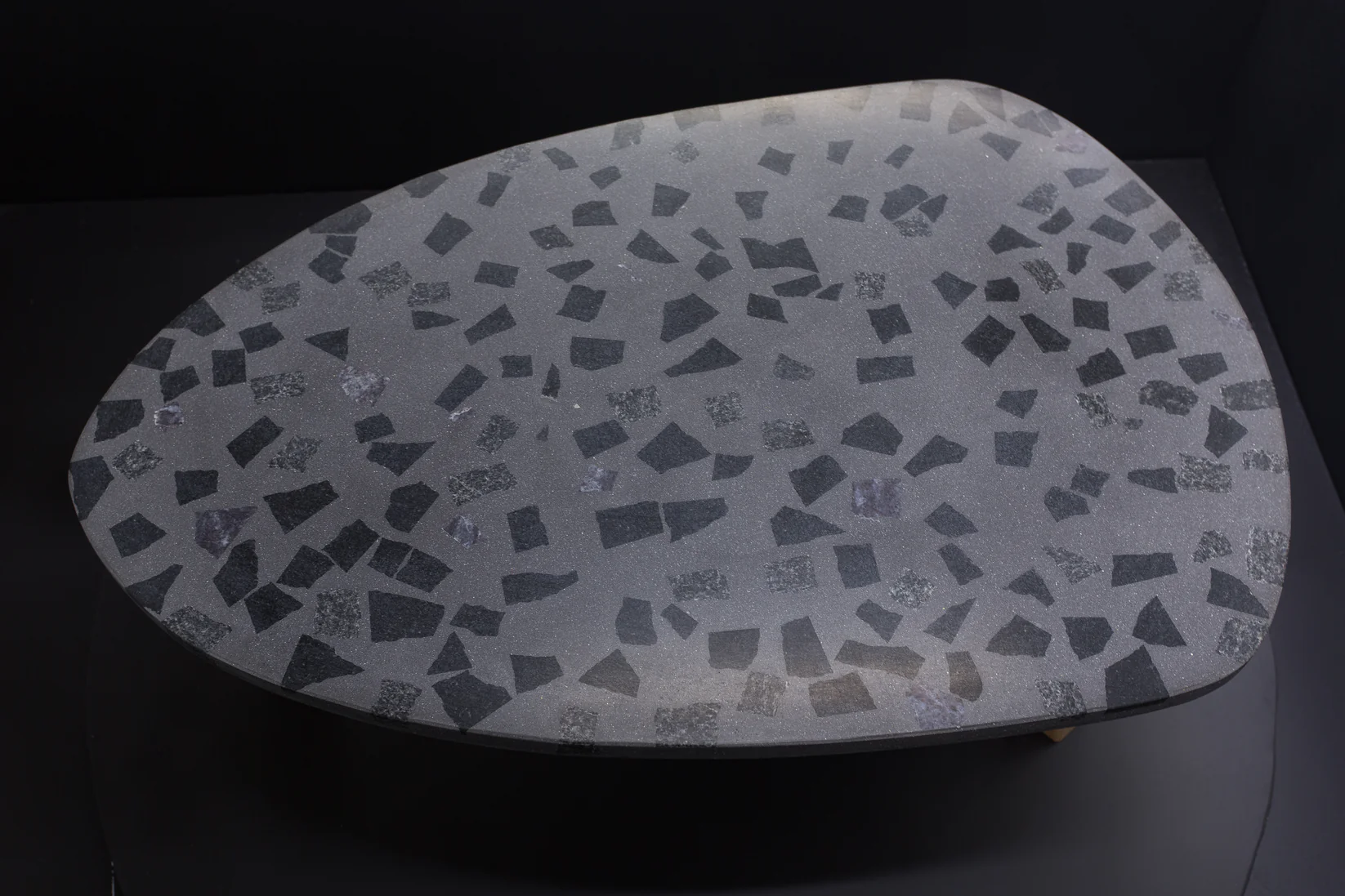Tento exkluzívny terrazzo stôl (90 × 60 cm) v tvare gitarového trsátka zaujme svojou ušľachtilou tmavosivou povrchovou úpravou s kvalitným tmavým granitom. S výškou 40 cm stojí na troch stabilných nohách z masívneho bukového dreva, ktoré mu dodávajú prirodzený a robustný vzhľad.